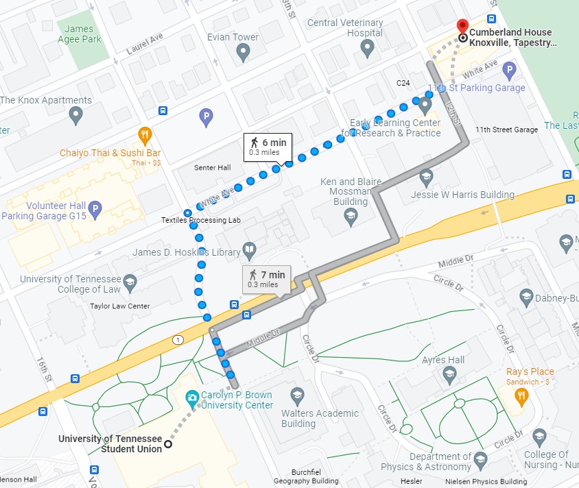 Conference Hotel: The Cumberland House hotel will serve as the official hotel of the 2024 ASMA Conference. The Cumberland House is situated 0.3 miles from the conference site, a walk of approximately 6 minutes (see map below). There is also a free trolley (orange line), which has stops directly in front of the hotel and Student Union. Conference attendees can book a room at the conference rate of $179 per night (plus tax) using the following link: ASMA 2024 Official Hotel – Cumberland House Knoxville, Tapestry Collection by Hilton